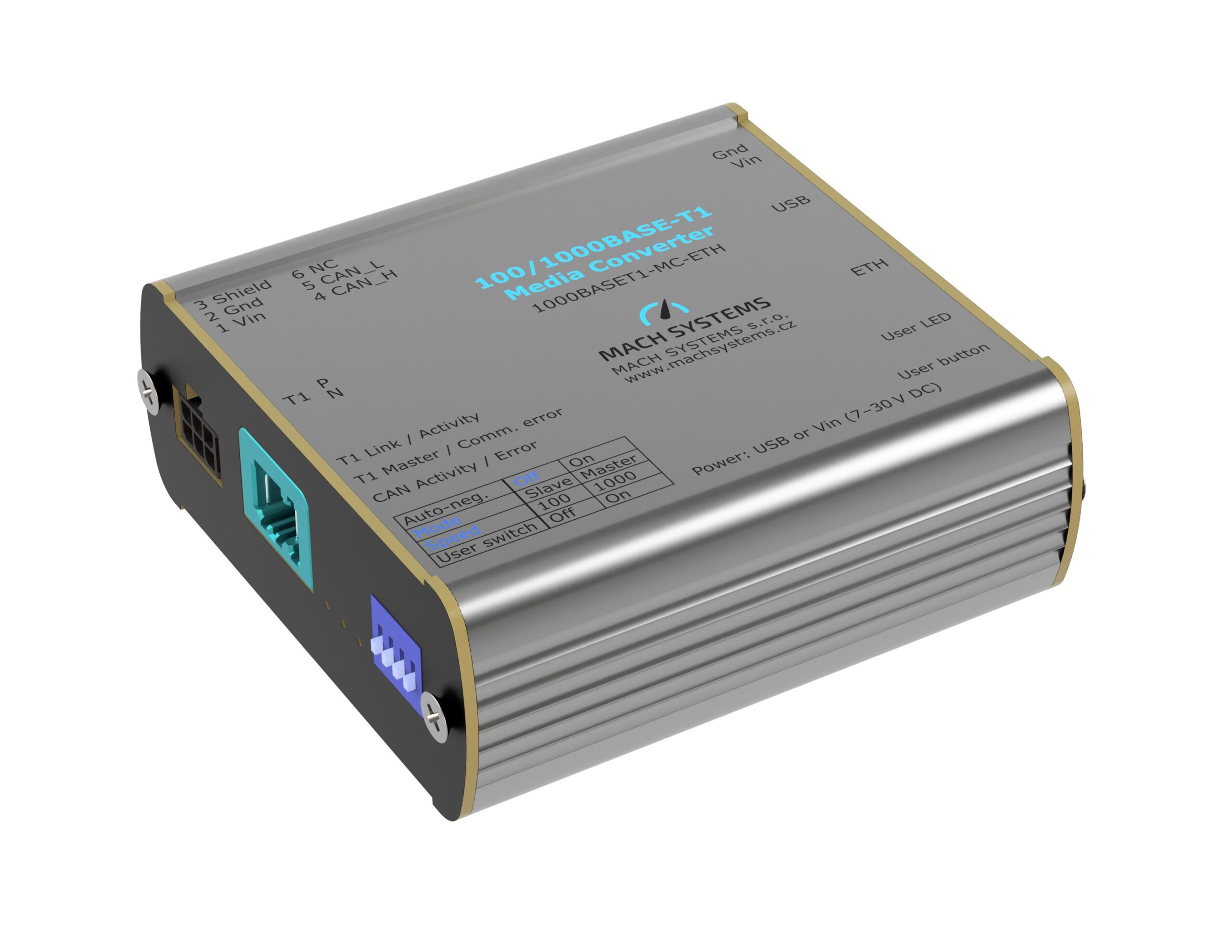 100BASE-T1 Media Gateway is a configurable Automotive Ethernet switch and communication bridge. The device can be used as frame sniffer (Active TAP), employing the packet forwarding function, as well as Ethernet – CAN(/FD) gateway, allowing data to be bi-directionally passed between any of the Ethernet ports and the CAN or CAN FD network.