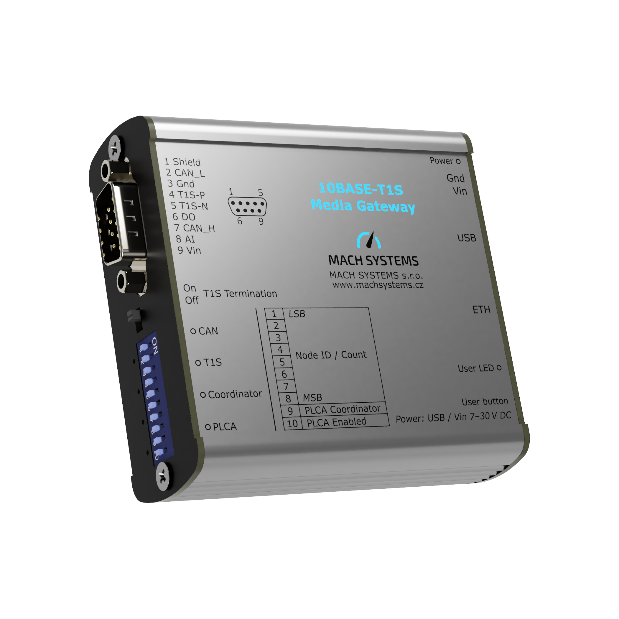 The 10BASE-T1S Media Gateway is a flexible 10BASE-T1S switch with CAN(/FD) gateway and user programming features. The device offers one 10BASE-T1S port, one Fast Ethernet port, a CAN channel with CAN FD support, and a USB 2.0 port. The media gateway can be used as a 10BASE-T1S – Ethernet switch (media converter) enabling a bi-directional communication between the 10BASE-T1S port, the standard Ethernet port, and the MCU, or as an Ethernet-CAN(/FD) gateway providing a data bridge between the Ethernet ports (10BASE-T1S and 100BASE-TX) and the CAN(/FD) channel. Gateway function for bridging a 10BASE-T1S network and a CAN/CAN FD bus can be configured over the embedded web server. The device can also be used as a USB to CAN(/FD) and an Ethernet – CAN(/FD) interface.
